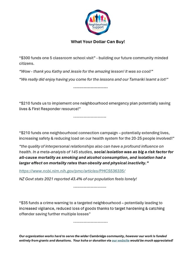 Cambridge Neighbourhood SupportCambridge Community PatrolEmergency PreparednessFriendshipFriendship and healthCambridge Community Patrol supports PoliceCommunity collaborationCommunity SpiritGood neighboursLocalNeighbourhood Support in ActionNeighbours working togetherSafer neighbourhoodsA grab bag could save your life!Are you OK?Avoid conflict with neighboursBecome a Neighbourhood Support CoordinatorCall 111Cambridge Charitable TrustCambridge CommunityCambridge Community HouseCambridge Neighbourhood Support and local PoliceCambridge Neighbourhood Support and NZ PoliceCambridge neighbourhood Support at Autumn FestivalCambridge Neighbourhood Support CampaignsCambridge Neighbourhood Support collaboration withCambridge Neighbourhood Support PodcastCambridge NZCambridge PoliceCambridge VolunteersCapable CommunitiesCar tamperingCar theftChildren learn CPRChildrens Citizenship ProgrammeComment on government billsCommunicating with neighboursCommunities making things happenCommunity SafetyCommunity Service in CambridgeCommunity support for PoliceConnection improves healthConnection in neighbourhoodsConnection increases longevityConnections improve healthCreate warm and supportive neighbourhoodsCrime is a community problemDonate for our communityEasy to connect with your neighboursFamily Harm SupportFENZFinding lost people in urban environmentsFire preventionFirearm safetyFirst Aid coursesFriendship supportGet helpGet readyGood connections mean better healthGovernanceGrab bagsHappy neighbourhoodsHautapu SchoolHow can I have my say to a government bill?How to create a community in your neighbourhoodHow to meet your neighboursInstall smoke alarms Cambridge NZIt can happen in New Zealand!Meet your neighboursNeighbourhood connectionNeighbourhood connection improves healthNeighbourhood emergency plansNeighbourhood groups prevent crimeNeighbourhood Support and community patrolNeighbourhood Support building connectionNeighbourhood Support in Retirement VillagesNeighbourhood Support Visits Vintage ClubNeighbourhood Support working with older peopleNeighbourhoods can lower crimeNeighbours connectNeighbours get togetherNeighbours meet for connection and safetyNeighbours take actionNetworking for SafetyNZ law makingPodcast Neighbourhood SupportPolice messageProtect your familyRequirements to join community patrolResilient communitiesResilient NeighbourhoodsResolving disputes with neighboursSafer CambridgeSafer Cambridge TrustSafer Cambridge Trust breadth of workSafer Cambridge Trust promotes collaborationSafer Cambridge Trust supporting older peopleSafety in rural neighbourhoodsSafety lessons for childrenSubsidized First Aid coursesSupportSupporting women who live with violenceTamahere Community MeetingThanks for supportThanks to the Cambridge Community BoardTips for meeting your neighboursTo Cambridge?Violence-Free WaipaWhat neighbourhood communties can achieve togetherWould you like to volunteer for the patrol